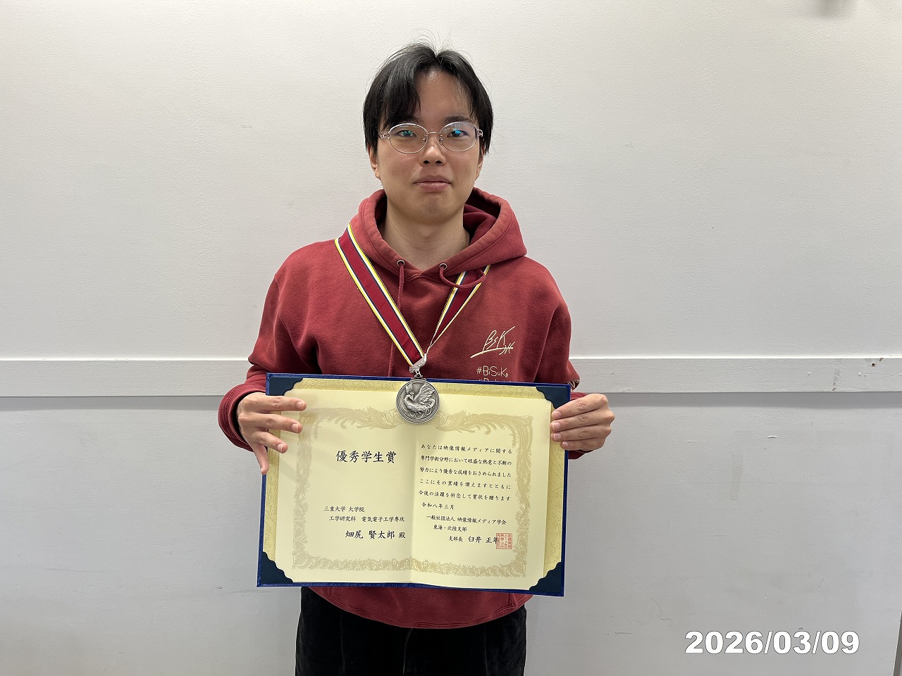 M1 畑尻賢太郎が映像情報メディア学会東海・北陸支部から優秀学生賞を受賞しました.本受賞は2026年2月20日に北海道大学(北海道札幌市)で開催された電子情報通信学会ITS研究会(高度交通システム研究会,映像情報メディア学会共催)での講演に対するものです.詳細はこちら